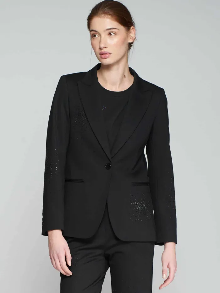Americana mujer con cuello solapa, hombreras y pedrería.