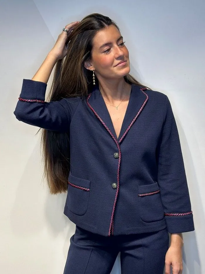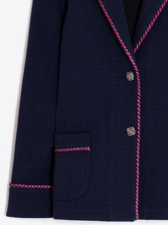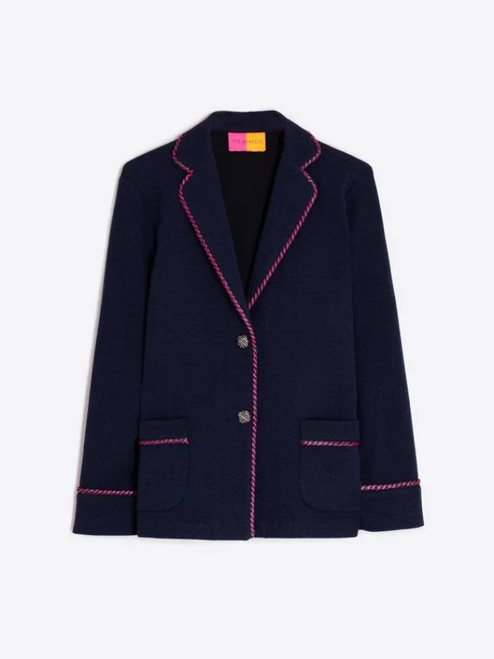 Chaqueta de espiga azul marino con ribetes en rosa y verde. Tejido elástico de punto roma fabricado en Italia. Cierre delantero con 2 botones con detalles. Sin forro.