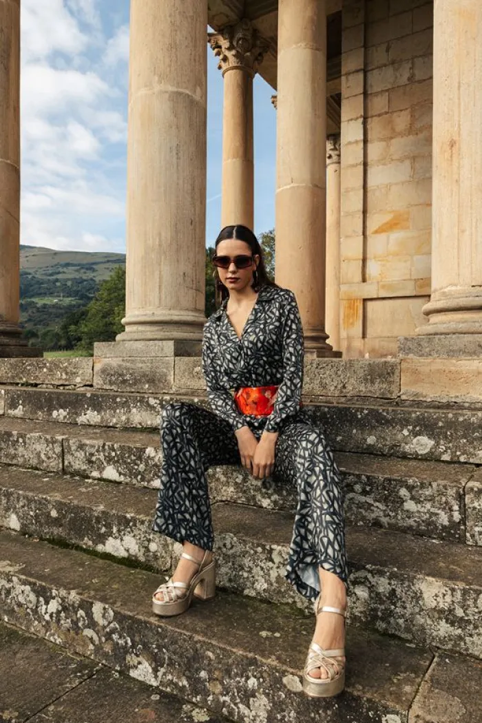 Americana mujer fluida con manga larga y cinturón estampada Selva. No incluye cinturón rojo.
