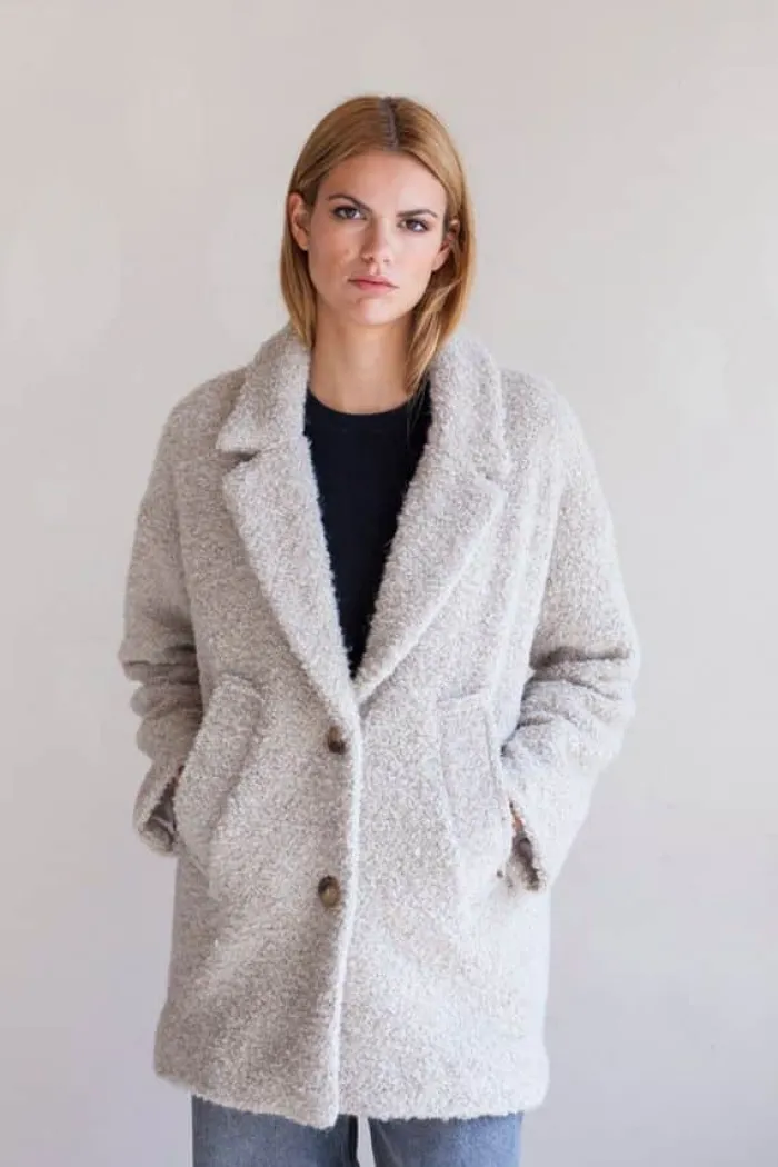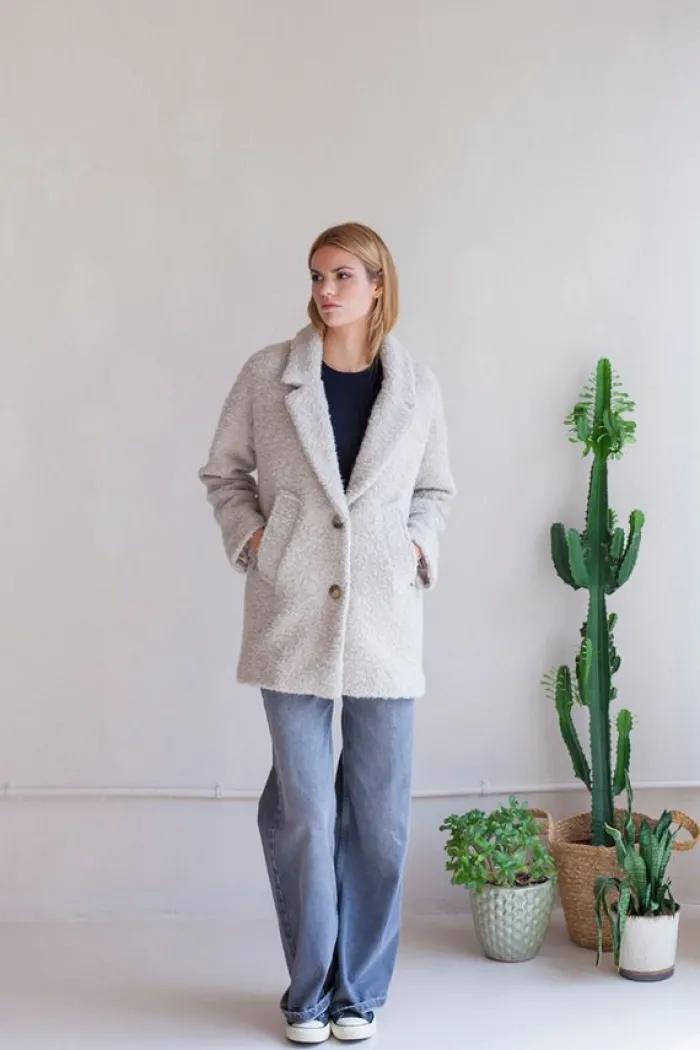 Chaquetón mujer cuello solapa en tejido de rizo.