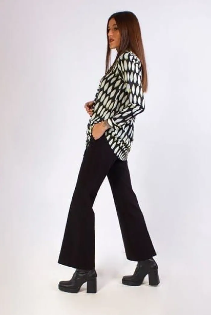 Pantalón de mujer con corte ancho en la parte inferior. Efecto trompeta y corto al tobillo. El tejido de esta prenda es punto milano combinado con viscosa/nylon.