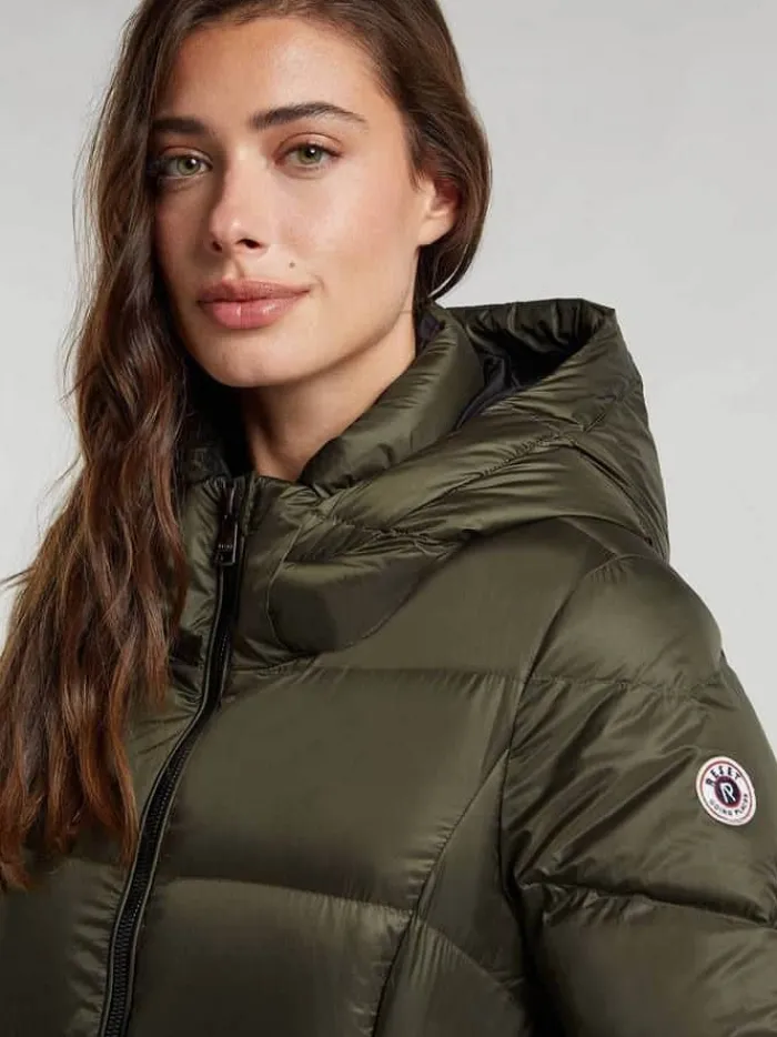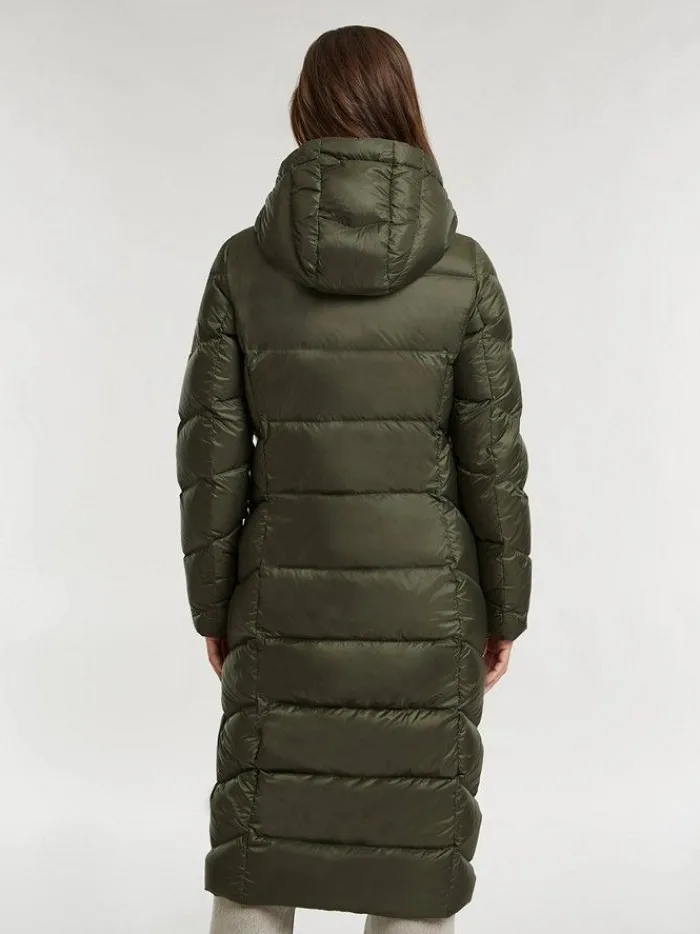 La larga longitud y el acolchado puntiagudo en los laterales acentúan el lado femenino de este ligero puffer. La capucha desmontable rellena de plumón con borde ajustable añade cobertura y calidez.