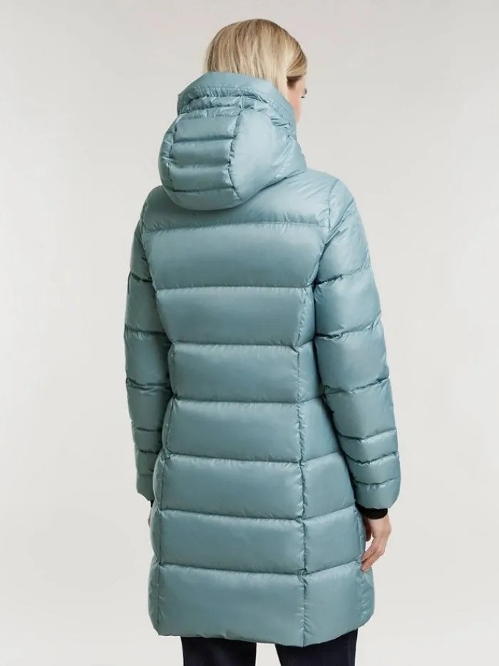 Plumas mujer largo con cuello chimenea y capucha.