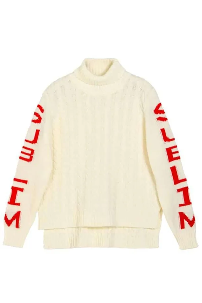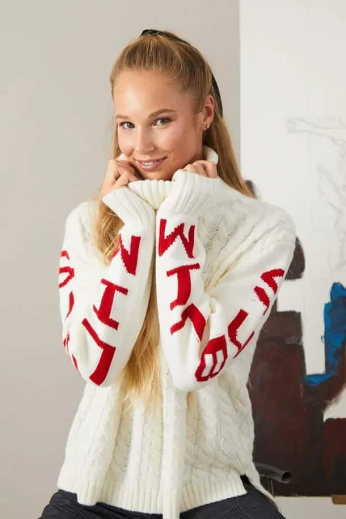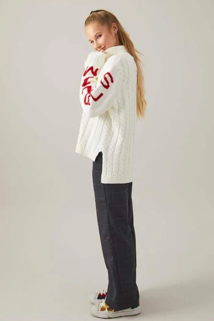 Suéter mujer con cuello chimenea de punto trenzado y intarsia en las mangas. Cuello cisne y manga larga. Delantero más corto que la espalda. Puños y bajos en canalé.