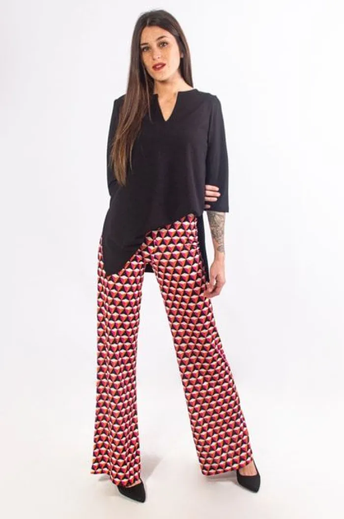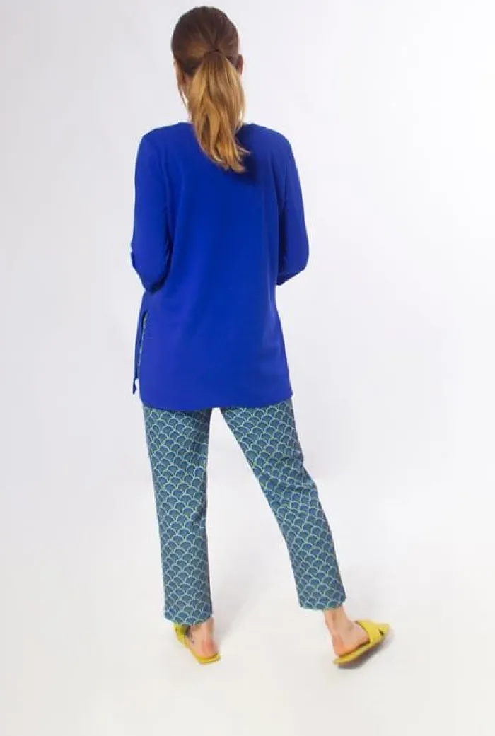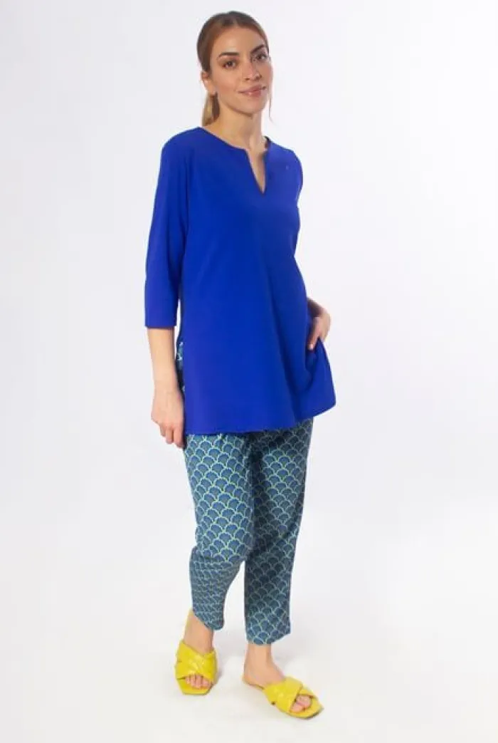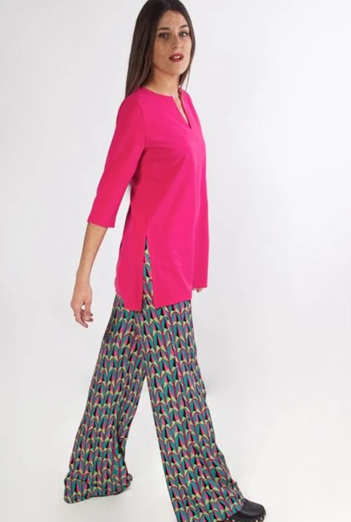 Top cuello pico con aberturas laterales y hombros abullonados. Tejido: crepé lisos. Disponibles en varios colores.