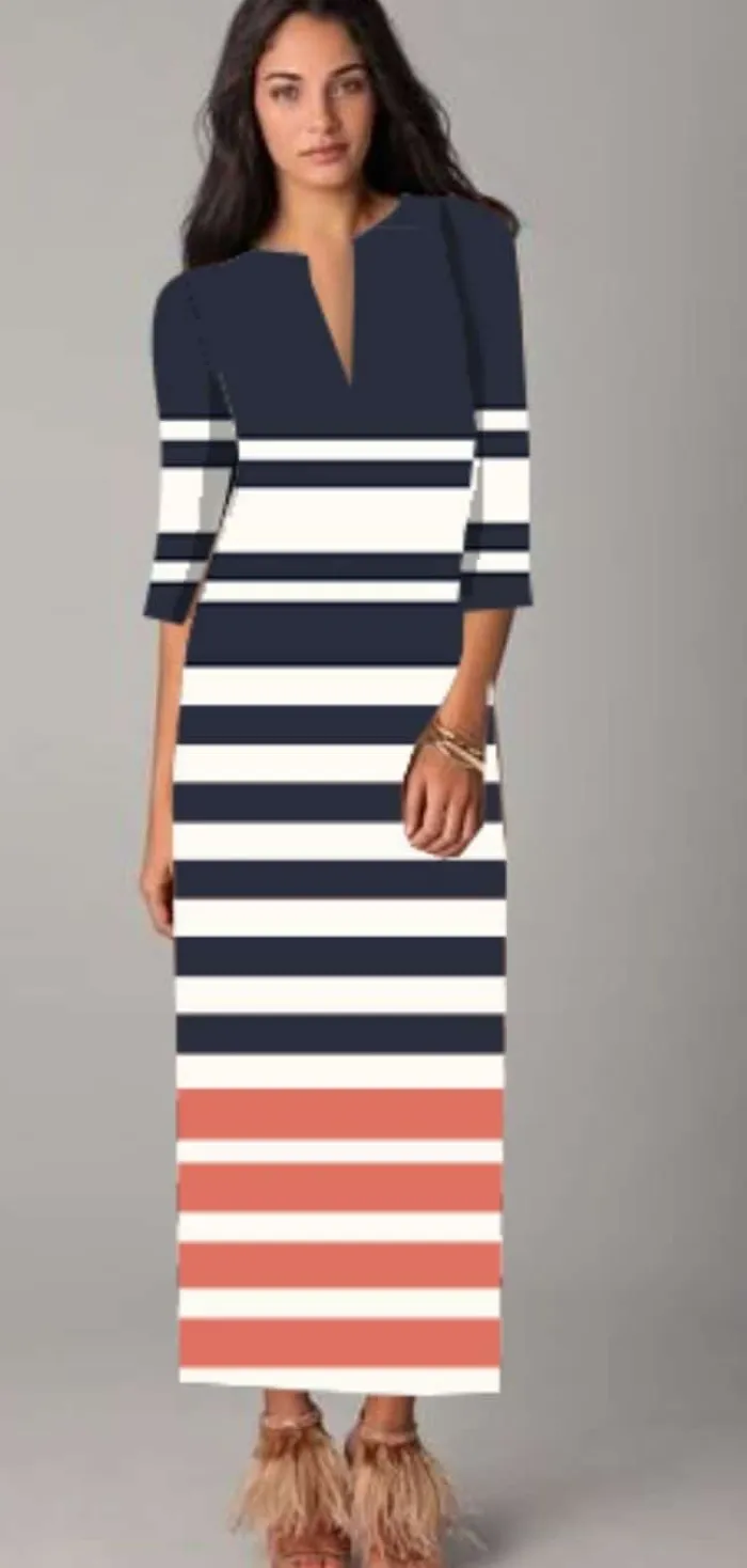 Vestido mujer largo con cuello en pico y manga 3/4 estampado Marsella.