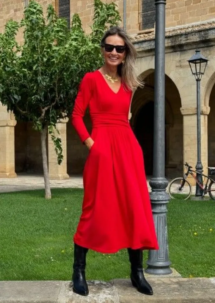 Vestido mujer midi cuello en pico con bolsillos rojo Jade.